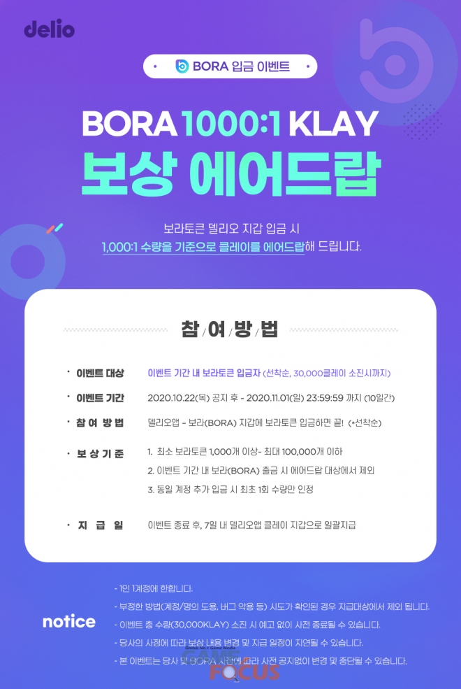 이번 이벤트는 BORA와 델리오가 BORA 디파이(De-Fi) 상품 출시를 준비하면서, BORA 토큰 홀더들에게 사전 혜택을 주기 위한 목적으로 기획되었다.