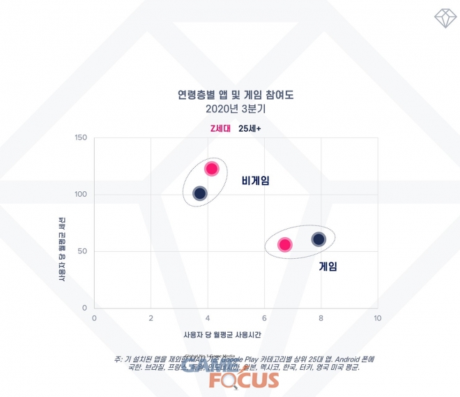 두 연령층 모두 월평균 사용 시간 기준으로 비게임 앱보다 게임 앱 사용시간이 높았지만, 기성세대가 Z세대 보다 게임 앱에 20% 더 오랜 시간을 보내고 10% 더 자주 접속하는 특징을 보였다. 이는 Z세대가 이전 세대에 비해 일상생활 전반에서 더 다양한 앱들을 활용하고 있다는 뜻이며, 그만큼 앱 퍼블리셔들에게 중요한 소비자층임을 의미한다.