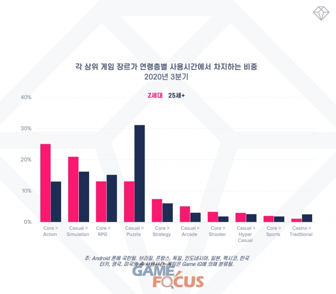 Z세대와 기존 세대는 즐겨 하는 게임 장르에서도 큰 차이를 보였다. 각 상위 게임 장르의 세대별 사용시간을 살펴보면 Z세대는 '배틀그라운드 모바일', '프리 파이어'와 같은 코어 액션 장르(25%), 이전 세대는 '캔디크러쉬사가'와 같은 캐주얼 퍼즐 게임(30%) 장르의 비중이 가장 높았다.