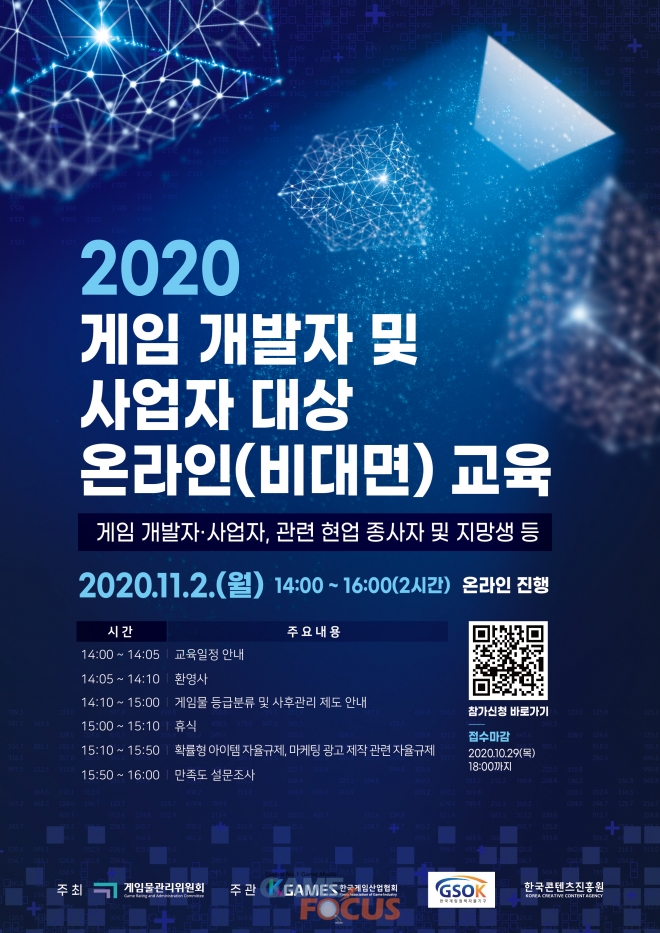 게임물관리위원회(이하 '게임위', 위원장 이재홍)가 내달 2일(월) 오후 2시부터 게임관련 개발자와 종사자, 게임개발 지망생 등을 대상으로 교육을 실시한다. 교육은 코로나 19 예방을 위해 실시간 비대면 화상교육으로 제공된다.