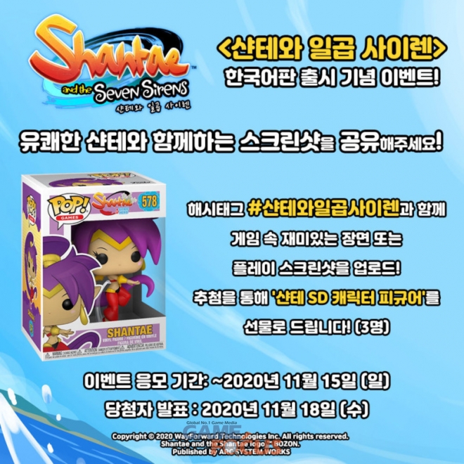 아크시스템웍스 아시아지점은 웨이포워드(WayForward Technologies)의 액션 어드벤처 시리즈 최신작, '샨테와 일곱 사이렌'의 PlayStation4와 Nintendo Switch 한국어 번역판을 29일 정식 출시했다고 발표하며, 출시 기념 이벤트를 오늘부터 개최한다고 밝혔다.