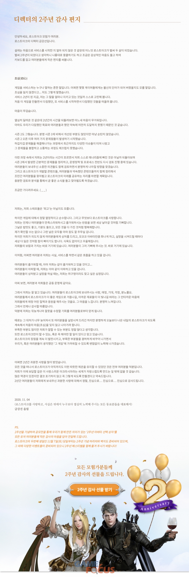 정식 론칭 2주년을 기념해 로스트아크의 금강선 디렉터가 공식 홈페이지에 게재한 '디렉터의 2주년 감사 편지'도 눈길을 끈다. 편지는 2년간의 서비스를 돌아보며 느낀 소회와 함께 그 시간 동안 로스트아크와 함께해준 유저들에 대한 감사의 마음을 담고있다.