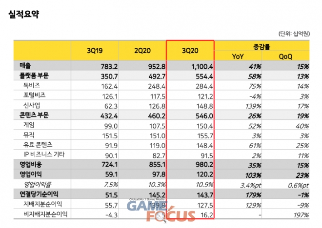 카카오는 K-IFRS(한국국제회계기준) 기준 2020년 3분기 매출이 전분기 대비 15%, 전년 동기 대비 41% 늘어난 1조 1,004억원을 기록했다고 밝혔다. 영업이익은 전분기 대비 23%, 전년 동기 대비 103% 증가한 1,202억원으로, 영업이익률은 10.9%다. 카카오톡을 기반으로 한 광고, 커머스 사업 및 글로벌 유료 콘텐츠 사업의 높은 성장세와 카카오 모빌리티, 카카오페이 등이 포함된 신사업 부문의 실적 개선이 사상 최대 실적을 이끌었다.