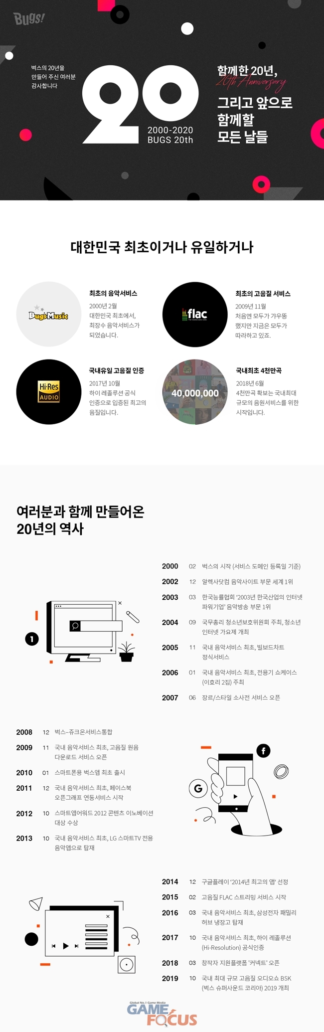 벅스는 홈페이지 및 모바일 앱에 20주년 어워즈 페이지를 신설하고, 20년간의 다양한 기록을 공개했다. 청취 횟수, '내 앨범'에 음악 담기 등 회원들의 이용 이력을 종합적으로 반영한 결과다. 국내 최장 음악 스트리밍 서비스인 벅스의 기록은 곧 '국내 음악 스트리밍의 역사'로도 의미가 크다.