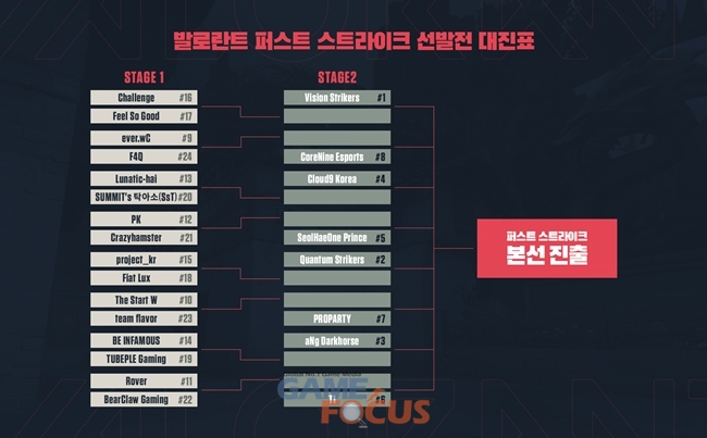 라이엇 게임즈가 주최하고 아프리카TV가 주관하는 발로란트 퍼스트 스트라이크 선발전은 12월에 열리는 본선에 진출할 최종 8개 팀을 가리기 위한 24강 싱글 엘리미네이션 토너먼트로, 11월 12일부터 22일까지 총 두 번의 스테이지로 진행된다.