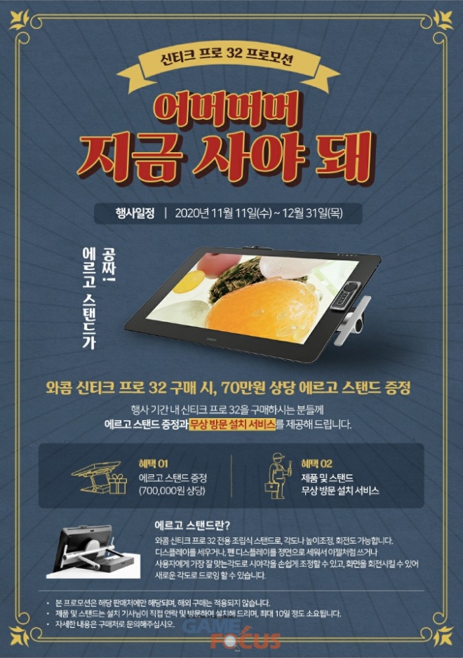 타블렛 전문 기업 와콤(Wacom)의 한국법인 한국와콤(대표 김주형)이 오는 12월 31일까지 '와콤 신티크프로32' 제품 구매자에게 70만원 상당의 전용 에르고 스탠드 증정과 함께 무상 방문 설치 서비스를 제공하는 이벤트를 실시한다.