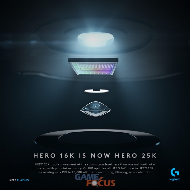 기존에 16,000 DPI까지 지원했던 HERO 16K 센서는 이번 소프트웨어 업데이트만으로 25,600 DPI까지 성능을 높여 1마이크론(0.000001m) 수준에서의 움직임도 정확하게 추적할 수 있는 세계 최초의 서브 마이크론 레벨(sub-micron level) 마우스 센서가 됐다.