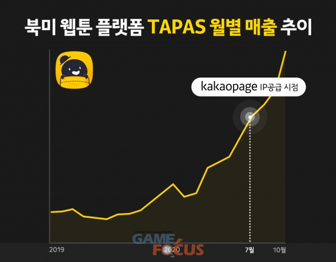 카카오페이지는 올해 7월부터 타파스에 주요 IP를 본격적으로 공급하며 매출을 견인하고 있다. 현재까지 공급한 작품 14개에서만 약 9억 5천만 원(총 85만불) 매출이 발생했으며 이 중 '사내맞선'은 출시 한달만에 약 1억 2천만 원 (총 10만5천불)의 매출을 기록했다. 픽코마를 통해 일본에서 선전을 이끈 카카오페이지의 IP들이 이제 북미 시장에서도 가파른 성장을 이끌며 기대감을 높이고 있다. 특히, 타파스의 월 매출은 카카오페이지 IP공급 후 올해 10월 기준 전년 동기대비 5배 상승했으며 IP공급 시점 전후로 약 30% 매출 상승률을 보였다.