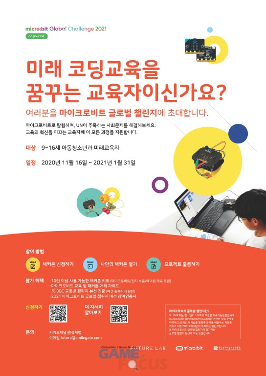 창의환경 연구센터 스마일게이트 퓨처랩(이하 퓨처랩)이 영국 BBC 마이크로비트 교육재단과 11월 16일부터 2021년 1월 31일까지, 온라인을 통해 글로벌 창의 올림피아드 '마이크로비트 글로벌 챌린지 2021(Micro:bit Global Challenge 2021)' 아시아 예선을 개최한다.