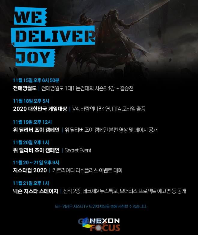 넥슨은 21일 오후 1시부터 약 1시간 동안 지스타TV를 통해 신작 커츠펠과 코노스바 모바일에 대한 게임 정보를 최초 공개하고, 넥슨재단 '보더리스: 티키타카 게임뒷담화' 예고편부터 네코제9 뉴스특보, '위 딜리버 조이' 캠페인 본편 영상까지 게임 팬을 위한 각종 비대면 볼거리를 제공한다.