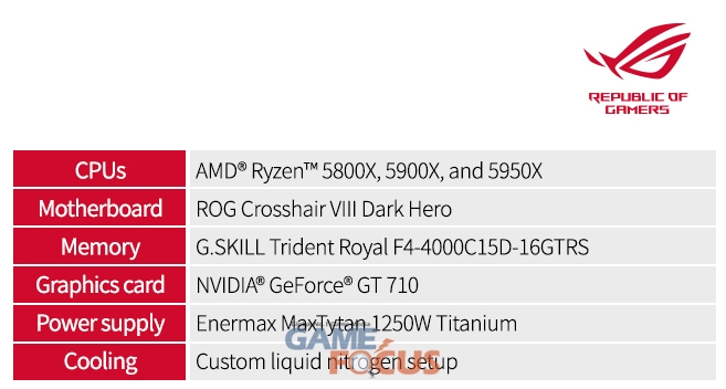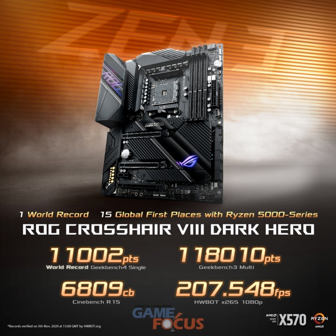 오버클럭에 사용된 ROG Crosshair VIII Dark Hero는 오버클러커 및 하드코어 게이머를 위한 메인보드로 AMD Zen 3 프로세서를 지원하는 X570을 기반으로 PCIe 4.0을 지원하며, 강력한 오버클럭킹을 위해 냉각성과 안정성을 향상시켰다.