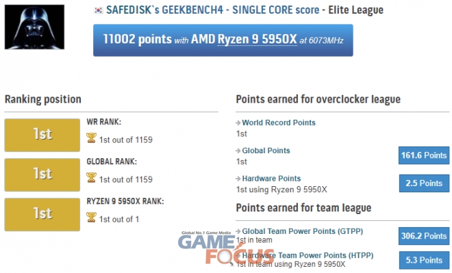 국내 익스트림 오버클러커 유저인 'SafeDisk'가 ROG Crosshair VIII Dark Hero와 AMD Ryzen 9 5950X를 기반으로 6,073MHz로 오버클럭에 성공, Geekbench4 싱글 코어 벤치마크에서 11,002 포인트로 전 세계 1위를 기록했다.