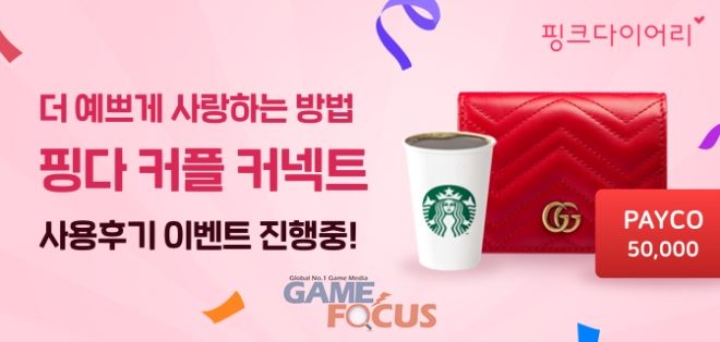 핑크다이어리는 이번 '커플 커넥트' 오픈을 기념해, 이용 후기 인증샷 이벤트를 진행한다. 커플 커넥트 기능을 이용한 인증샷과 함께 이용 후기를 핑다톡 이벤트 게시판에 올리면, 추첨을 통해 구찌 마몽 GG카드지갑(1명), 페이코 상품권(5명), 스타벅스 기프티콘(50명) 등을 증정한다. 이벤트 참여 기간은 오는 12월 15일까지다.