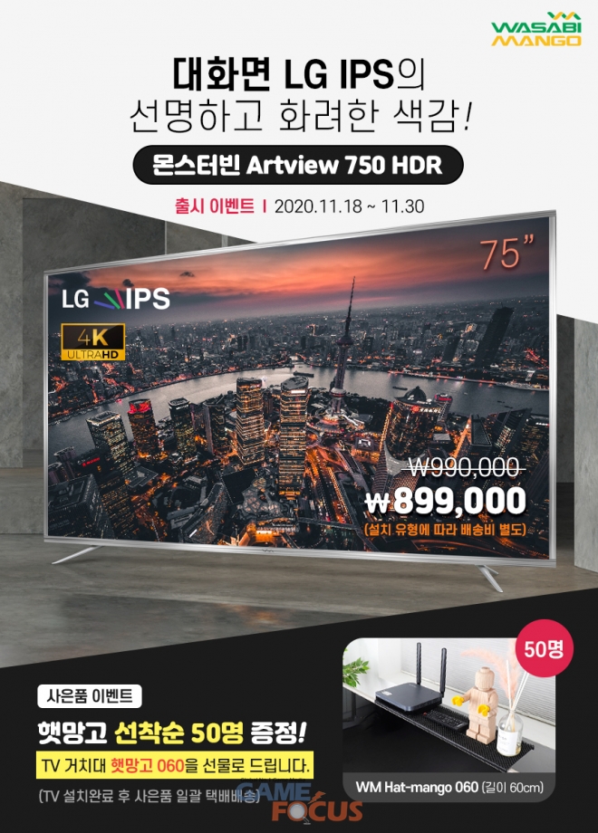 와사비망고(대표 김환준)가 LG IPS 패널을 탑재한 4K UHD TV '몬스터빈 Artview 750 HDR'을 11월 18일 공식 출시한다. 또한 11월 30일까지 특가 및 사은품 증정 이벤트를 진행한다.