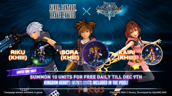 gumi Inc.가 Square Enix Inc.와 공동 개발하고 자사가 서비스하는 모바일 RPG 'FINAL FANTASY BRAVE EXVIUS'와 인기 모바일 게임 KINGDOM HEARTS Uχ Dark Road와의 두 번째 콜라보레이션을 진행한다. 이번 콜라보를 통해 이용자는 12월 10일(목)까지 두 게임에서 모두 콜라보 이벤트에 참여하고, 풍성한 보상을 획득할 수 있다.
