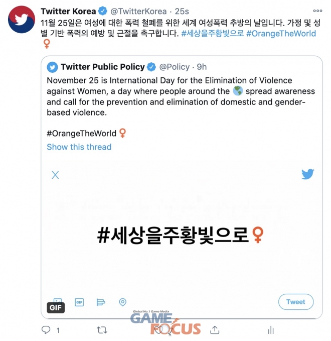 트위터가 11월 25일 세계 여성폭력 추방의 날부터 12월 10일 세계인권선언기념일까지 16일 동안 여성폭력 반대 및 인권 향상 관련 글로벌 캠페인 '세계여성폭력추방주간(16 Days of Activism)'을 적극 지원한다.