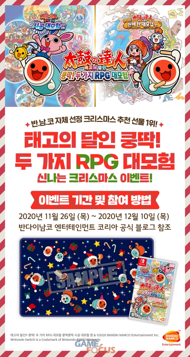Nintendo Switch용 '태고의 달인 쿵딱! 두 가지 RPG 대모험'(한국어 번역판)의 발매와 다가오는 크리스마스를 기념해 푸짐한 경품을 제공하는 퀴즈 이벤트를 실시한다. 본 이벤트는 발매일인 오늘부터 오는 12월 10일 (목)까지 반다이남코 엔터테인먼트 코리아 공식 블로그에서 진행된다.