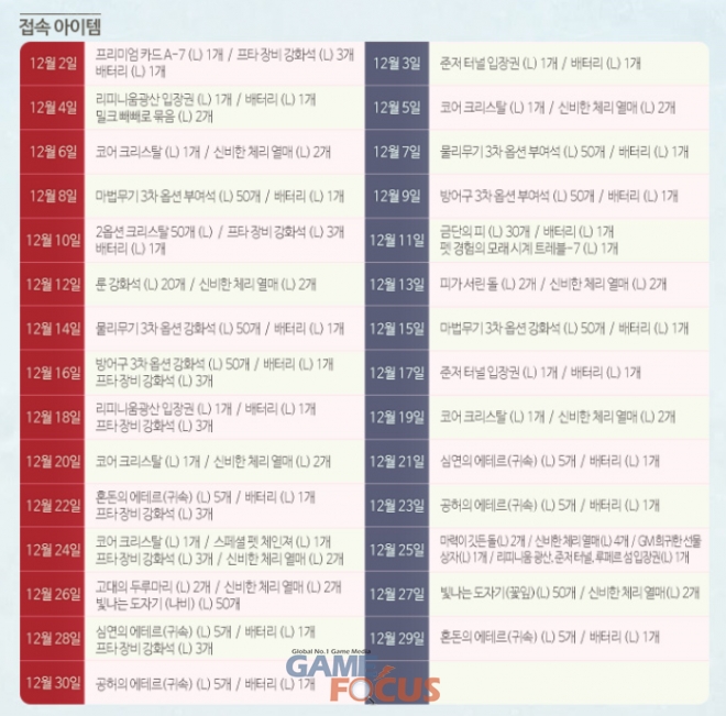 이번 이벤트는 12월 2일 수요일 정기점검 후부터 12월 30일 수요일 23시 59분 59초까지 진행되며, 기간 내 접속 시 매일 보상이 지급된다. 단, 3차 승직 251레벨 이상 캐릭터를 가지고 있어야 한다.