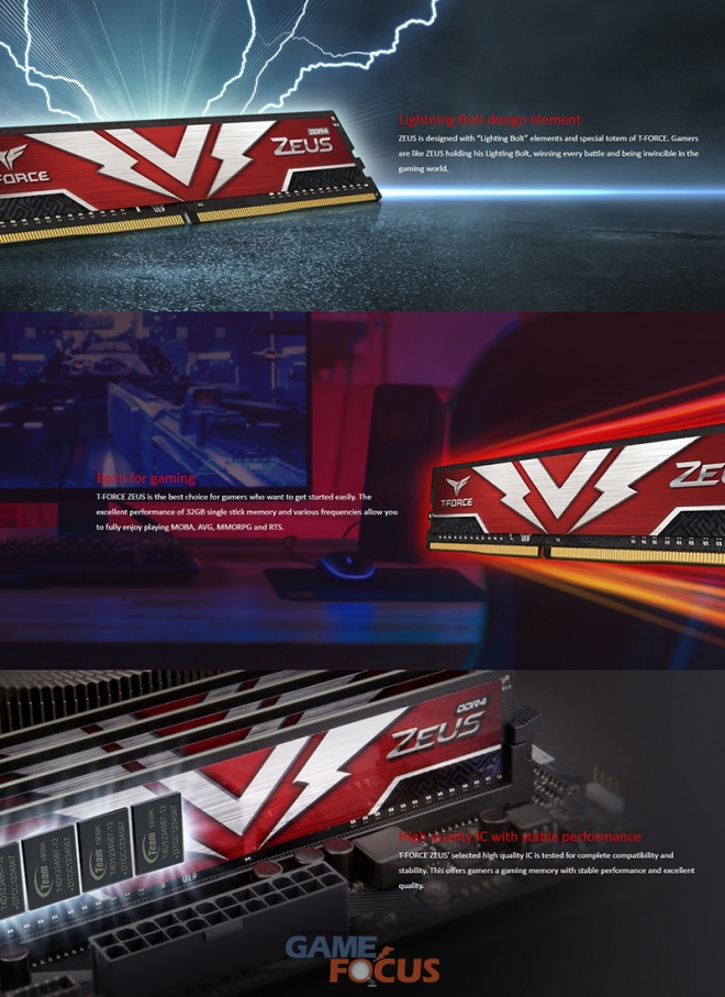 이를 통해 제우스 시리즈는 단조로운 PCB 기판 위에 IC 모듈만이 장착된 일반적인 PC메모리가 아닌, 'ZEUS', 'T-FORCE' 로고, '라이트닝 볼트 디자인' 등이 포인트로 더해져 화려한 RGB LED 나 디자인이 가미된 히트 싱크 없이도 사용자에게 미적인 만족감을 전달한다.