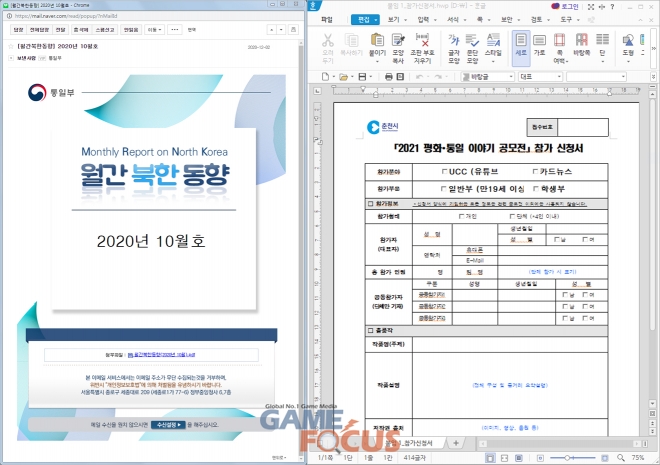 다만 실제 올해 개최되는 공모전의 정식 명칭은 '2020 평화∙통일 이야기 공모전'이지만, 발견된 악성 문서에는 '2021 평화∙통일 이야기 공모전' 참가 신청서로 기재되어 있어 공격자가 개최 연도만 교묘히 조작한 것으로 확인되었다.