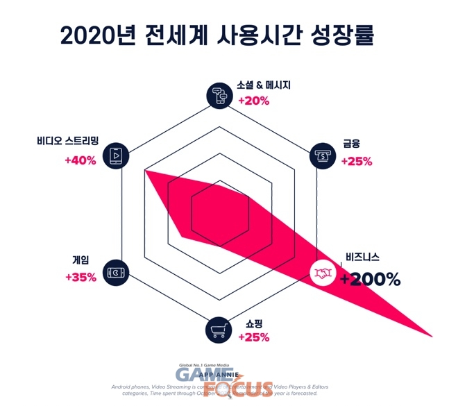 2020년 모바일 시장에서 가장 눈에 띄는 성장률을 보였던 분야는 사용시간이었다. 이는 모바일 앱 사용 인구와 일일 사용시간이 증가한 결과로 해석된다. 전세계적으로 사용시간이 가장 가파르게 성장한 카테고리는 ‘줌 클라우드 미팅’ 등의 협업 및 화상회의 툴이 있는 비즈니스 카테고리로 나타났다. 직장 및 학교에서 오프라인 미팅, 수업 등의 대체재로 자리잡은 비즈니스 앱의 사용시간은 올해 200억 시간을 기록하며 전년 대비 200%나 성장했다.
