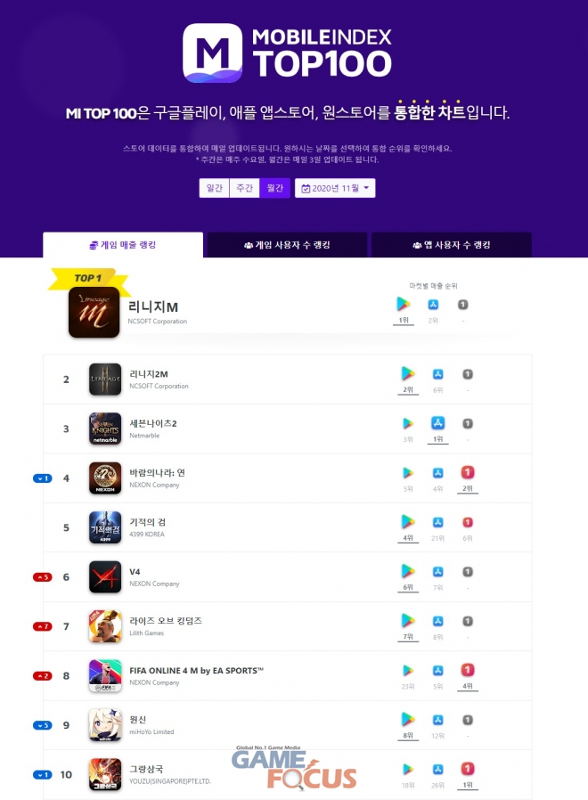 3대 모바일 앱마켓의 게임 랭킹 순위를 발표하는 모바일인덱스에서 게임 매출을 기준으로 한 11월 모바일 게임 통합 랭킹 차트를 발표했다.