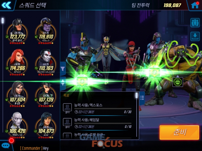 적의 위협에 대항해 아이언맨, 캡틴 아메리카, 스파이더맨, 토르, 헐크, 닥터 스트레인지, 블랙 위도우, 그루트, 로켓 라쿤, 울버린 등 슈퍼 히어로와 타노스, 로키, 베놈 등 슈퍼 빌런이 강력한 스쿼드를 구성하고 전략적인 전투를 지휘하는 방식으로 게임이 진행된다.