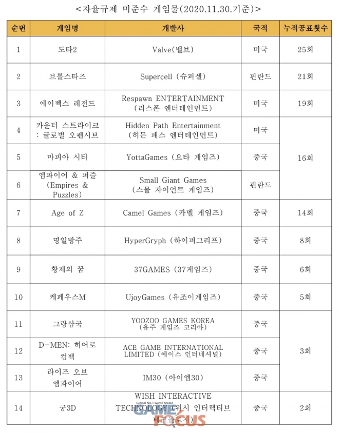 한국게임정책자율기구(이하 ‘기구’)는 한국게임산업협회(이하 ‘협회’)에서 시행하고 있는 강화된 “건강한 게임문화 조성을 위한 자율규제 강령(이하 ‘강령’)”에 따라 미준수 게임물을 2020년 12월 21일 25차 공표하였다.