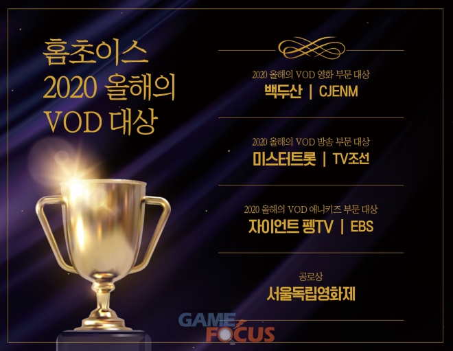 홈초이스(대표 조재구)는 올해 케이블TV VOD 서비스에서 가장 인기를 누렸던 작품에게 주어지는 '2020 올해의 VOD 대상'을 발표했다.