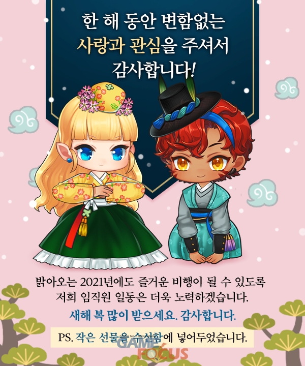먼저 유저 성원에 대한 보답 및 올해에도 즐거운 비행이 될 수 있도록 더욱 노력하겠다는 새해 기념 메시지를 공개, 오는 31일까지 게임 내 인기 캐릭터인 ‘엘리자베스’와 ‘카푸’가 전하는 해당 메시지를 게임 접속 시 확인할 수 있다.