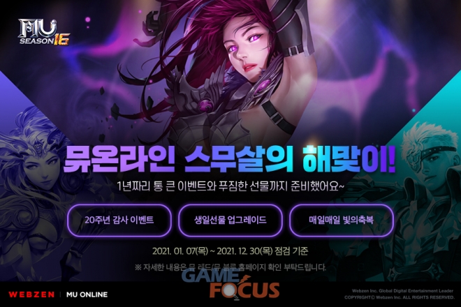 웹젠(대표 김태영)이 PC MMORPG '뮤 온라인'에서 20주년을 맞아 회원들을 위해 '감사 이벤트'와 '신년맞이 이벤트 2탄'을 실시한다.