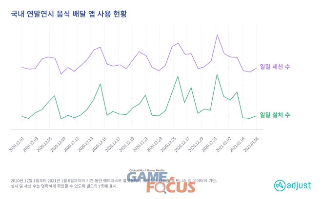 국내 배달 앱 세션 수는 크리스마스 이브와 크리스마스 당일 52% 증가했으며, 앱 설치 수는 68% 증가했다. 이와 같은 동향은 연말까지 지속되어, 12월 31일 앱 세션 및 설치 수 모두 월 평균 대비 45% 증가했다.