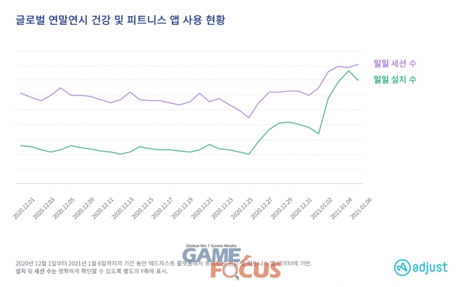 코로나19 사태에도 불구하고 전세계적으로 사용자들의 새해 결심은 지속된 것으로 나타났다. 크리스마스 연휴기간 동안 건강 및 피트니스 앱 사용률은 하락했으나, 1월 첫 주 설치 수와 세션 수는 각각 전월 평균 대비 89%와 24% 증가했다. 또한, 칼로리 추적 앱은 크리스마스 당일 사용률이 저조하였으나, 1월 첫 주 앱 설치 수가 91%, 세션 수가 34%로 급증하며 건강 및 피트니스 앱과 비슷한 동향을 보였다.
