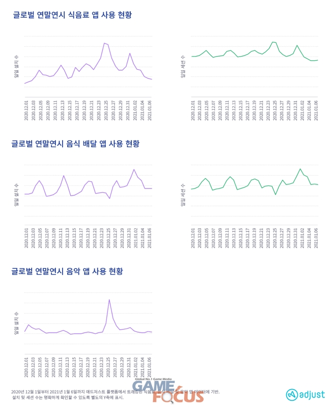 글로벌 음악 앱 설치 수는 크리스마스 당일 평균 대비 75% 증가했으며, 12월 31일에는 6% 증가했다. 국내 음악 앱 설치 수는 크리스마스 이브에 46% 급증했으며, 세션 수 또한 12% 증가했다.