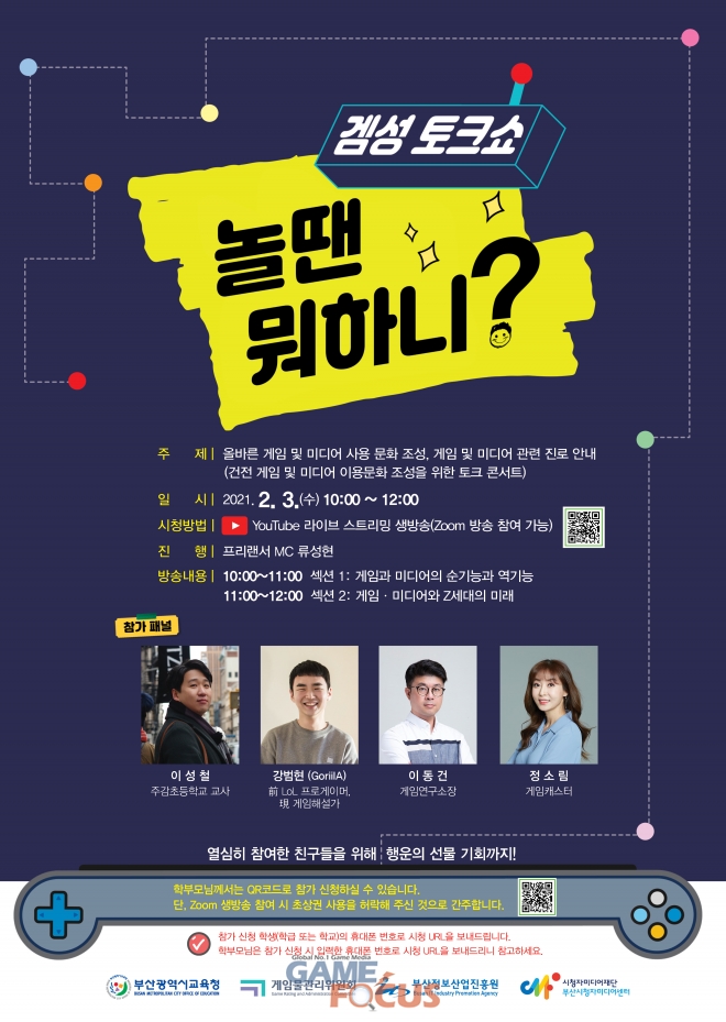 실시간 화상회의 도구(ZOOM)를 통한 행사 참가를 희망할 경우 게임위 누리집 알림창 및 포스터 하단 QR코드를 통해 신청 가능하며, 별도 신청 절차 없이 부산교육 유튜브 채널을 통해서도 시청할 수 있다.