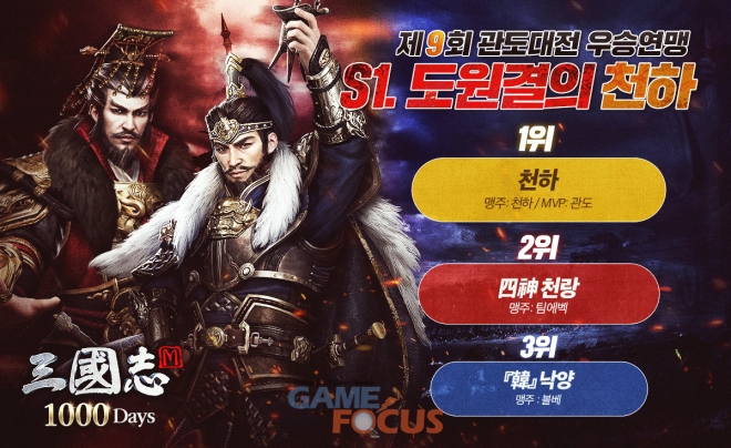 이펀컴퍼니(Efun Company Limited)가 서비스하고 Teamtop Games가 개발한 전략 모바일 게임 '삼국지M'의 서비스 1,000일 기념 이벤트로 개최한 '제9회 관도대전'에서 'S1-도원결의 천하' 연맹이 최종 우승을 차지했다.