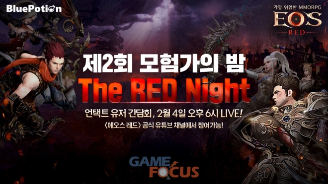 블루포션게임즈(대표 신현근)가 자사에서 직접 개발하고 서비스하는 모바일 정통 MMORPG '에오스 레드'의 유저간담회 '제2회 모험가의 밤 : The RED Night'를 2월 4일 18시에 언택트 방식으로 진행한다.
