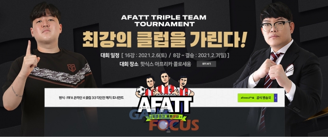 아프리카TV는 6일(토)과 7일(일) 양일간 EA코리아 스튜디오가 개발하고 넥슨이 서비스하는 'EA SPORTS FIFA Online 4(이하 FIFA 온라인 4)'로 진행되는 아마추어 대회 'AfreecaTV FIFA Online 4 Amateur Triple team Tournament(이하 AFATT) 클럽대전'의 본선 경기를 진행한다고 밝혔다. '클럽대전'은 최근 업데이트된 '클럽' 시스템을 통해 모인 'FIFA 온라인 4' 유저들이 최강 클럽의 명예를 걸고 승부를 펼치는 오픈리그 대회다.