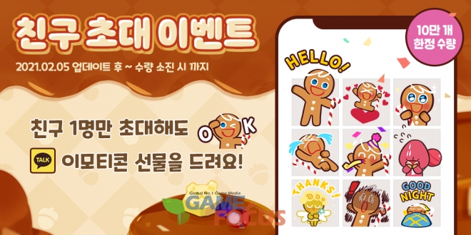또한 카카오톡 이모티콘 증정 이벤트도 5일부터 진행된다. 친구 초대 이벤트에 참여해 1명 이상의 친구를 초대한 유저에게는 카카오톡 이모티콘인 '지나치게 귀여운 쿠키티콘'을 선물한다. 해당 이모티콘은 10만명에게 선착순으로 제공되며, 다운로드 후 30일 동안 사용할 수 있다.