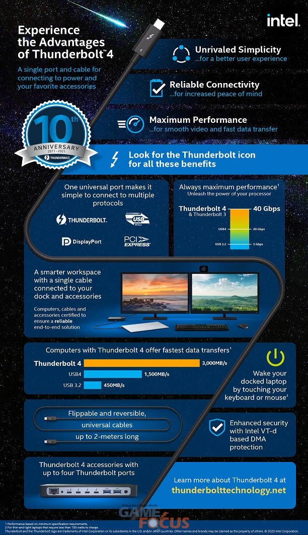 그 해결책으로 인텔은 데이터, 비디오 및 전원을 단일 소형 커넥터에 통합하는 썬더볼트(Thunderbolt™) 기술을 출시했다. 썬더볼트는 사용자가 단일 커넥터를 사용하여 PC, 도킹, 모니터, 솔리드 스테이트 드라이브, 외장 하드 드라이브 및 카메라와 같은 연결된 스마트 장치 사이에서 신속하고 데이터 손실 없이 전송이 가능하게 했다. 당시에 이미 썬더볼트는 고화질 장편 영화를 30초 이내에 전송하거나, 1년 동안 재생할 수 있는 MP3 음악을 단 10분 만에 백업할 수 있는 능력을 갖췄다.
