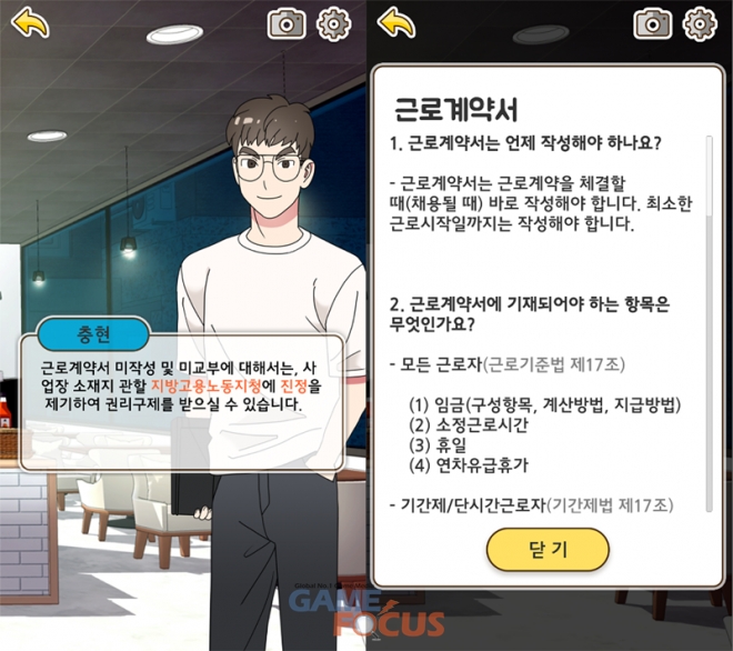 근로기준법에 대한 자세한 설명이 포함되어 있지만, 극대화된 리얼리티와 반전 있는 스토리로 일반적인 교육용 게임과 차별화된 재미를 보여준다.