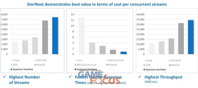 독립적인 비영리 컴퓨팅 시스템 테스트 기관인 SPEC(Standard Performance Evaluation Corporation)의 'SPEC SFS 2014 벤치마크(파일 서버 처리량과 응답 시간을 측정하는 벤치마크 툴)' 테스트에서 퀀텀 스토어넥스트 7(StorNext 7) 시스템은 동시 스트림(concurrent stream)당 훨씬 낮은 비용으로 2순위 경쟁사보다 57% 적은 스토리지 노드로 구현된 레퍼런스 아키텍처를 통해 총 3개의 성능 지표에서 타사의 모든 경쟁 파일 시스템을 크게 앞서는 결과를 얻었다.