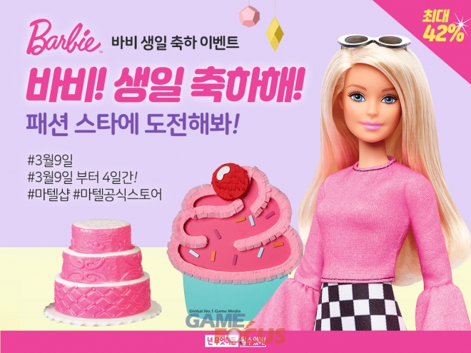 바비 생일 축하 이벤트는 마텔 공식 온라인몰 마텔샵과 네이버 마텔 공식 스토어를 통해 3월 9일(화)부터 11일(목)까지 3일간 진행되며 12일(금)에는 지마켓에서 '바비 B-DAY' 기획전으로도 만날 수 있다.