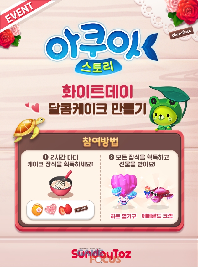 선데이토즈(대표 김정섭)는 자사의 모바일 SNG '아쿠아스토리'에 화이트데이를 맞아 '달콤케이크 만들기' 이벤트와 콘텐츠 업데이트를 진행한다고 9일 밝혔다.