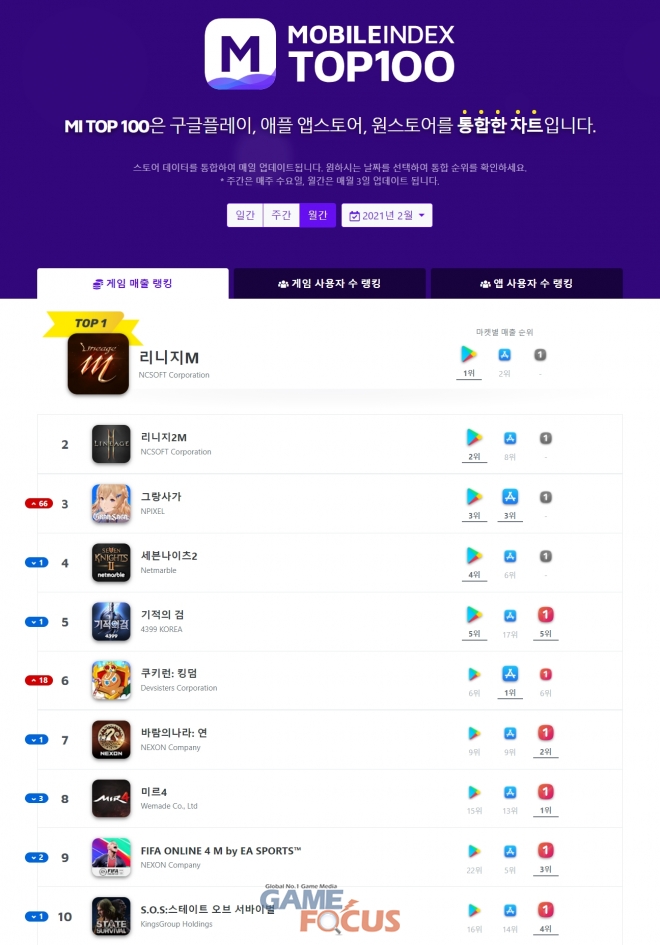 엔씨소프트의 '리니지M'과 '리니지2M'은 지난달에 이어 2월 통합 랭킹에서도 나란히 1위와 2위 유지해 '리니지 형제'의 저력을 과시했다.