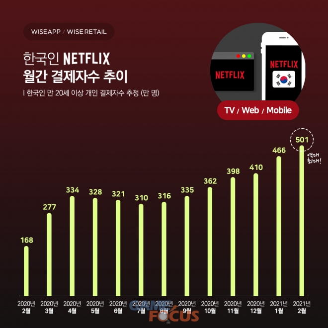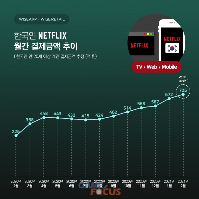 와이즈앱·와이즈리테일이 만 20세 이상 한국인 개인이 신용카드, 체크카드로 결제한 금액을 표본 조사한 결과, 2021년 2월 한 달간 넷플릭스에서 결제된 금액은 725억 원으로 역대 최대로 추정됐다.
