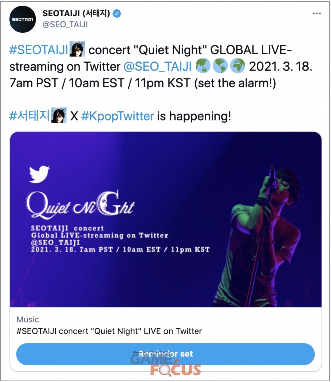 서태지의 '콰이어트 나이트' 콘서트 영상을 트위터에서 즐길 수 있다. 서태지의 트위터 글로벌 라이브스트리밍은 이번이 처음으로, 전 세계 팬들이 트위터를 통해 집에서 서태지의 공연을 감상할 수 있게 됐다.
