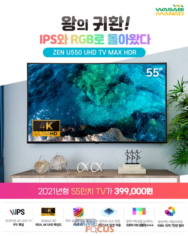와사비망고(대표 김환준)가 IPS 패널을 탑재한 2021년형 4K UHD TV인 'ZEN U550 UHD TV MAX HDR'을 3월 19일 공식 출시한다.