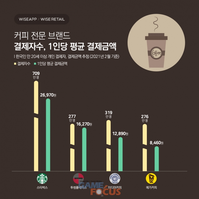 스타벅스는 올해 2월 한 달 동안 709만 명이 평균 26,970원을 결제했으며 상위 7개 커피 전문점 브랜드 중 결제금액, 결제자수, 1인당 평균결제금액에서 모두 1위였다.