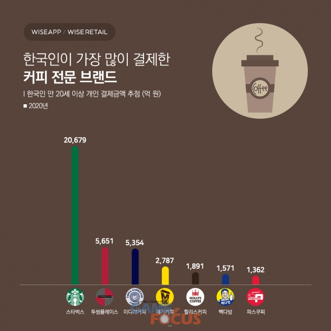 와이즈앱·와이즈리테일이 만 20세 이상 한국인 개인이 신용카드, 체크카드 등으로 결제한 금액을 표본 조사해 발표했다. 조사 결과에 따르면 작년 한 해 결제금액이 가장 많았던 커피 전문 브랜드는 스타벅스였다. 스타벅스의 작년 한 해 결제금액은 2조 679억 원이었다.